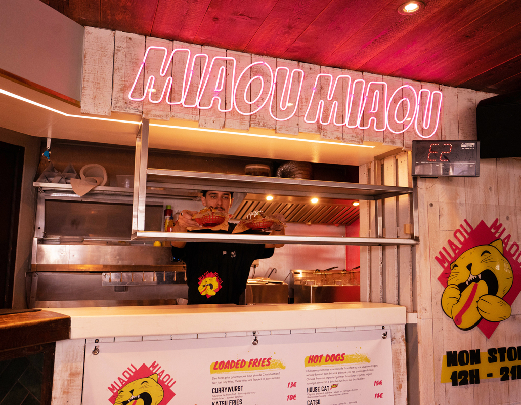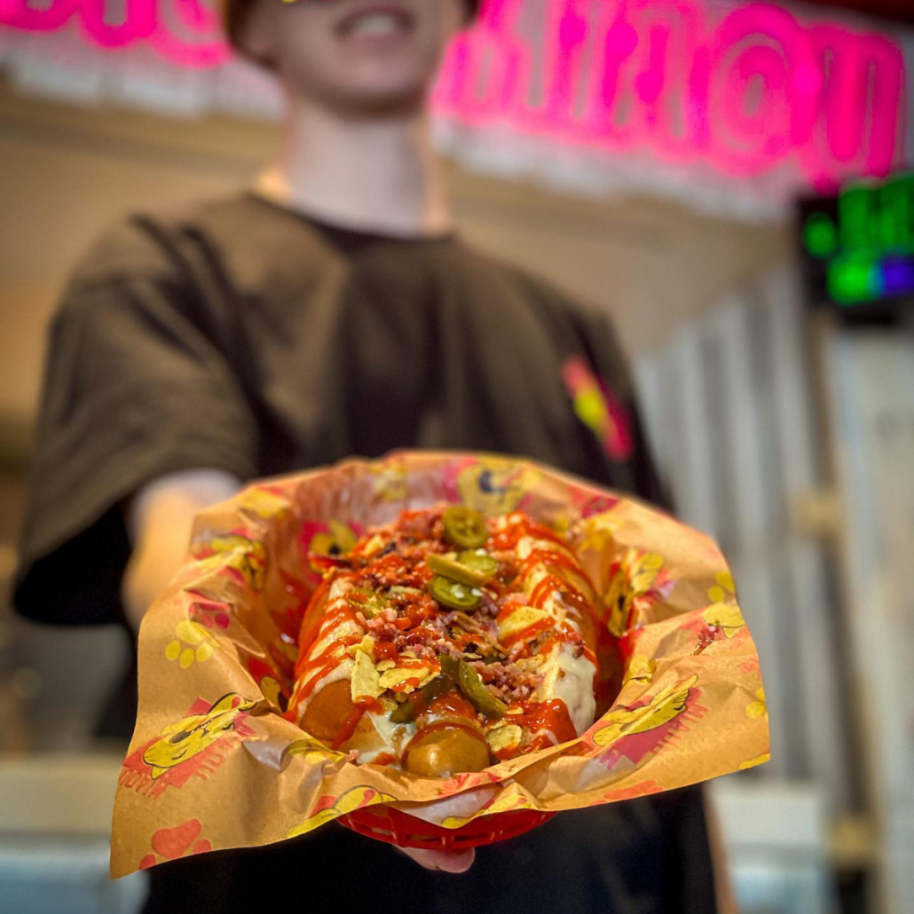 An illustrated logo design for a hotdog counter at a bar. The logo is used across signage, packaging and merchandise